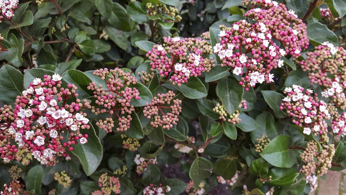 - Viburnum tinus: fiorisce proprio quando il resto del giardino dorme. I suoi fiori bianchi sbocciano in inverno, offrendo una presenza viva nei mesi più spenti.
